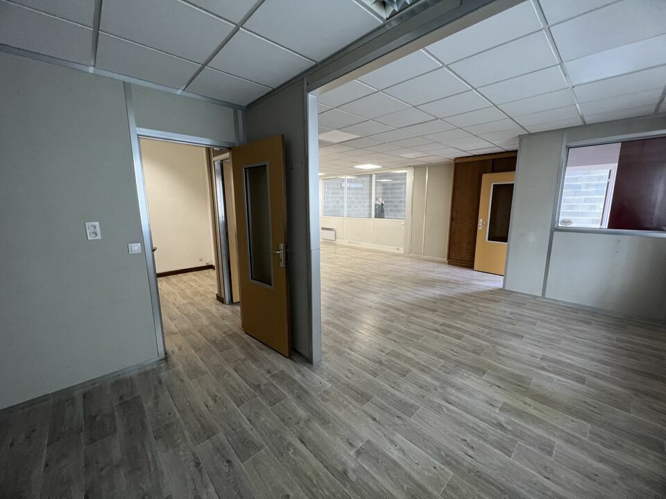 Le local bénéficie d'équipements : porte sectionnelle, chauffage thermique, de nombreuses fenêtres dans les bureaux, offrant un environnement de travail agréable et lumineux.